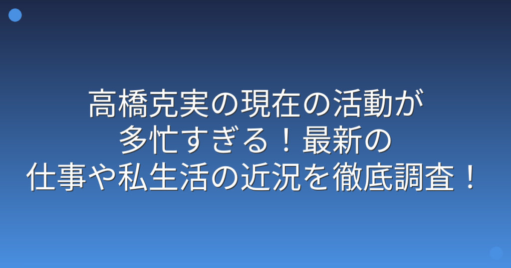 俳優やタレントとして長年活躍している高橋克実さんですが、最近の活動状況が気になっている方も多いのではないでしょうか。 テレビで見かける機会も多い高橋克実さんですが、現在どのような仕事をされているのか、プライベートはどうなのか注目が集まって... -