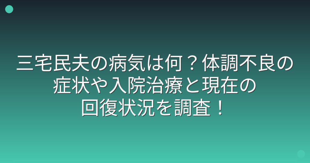 三宅民夫の病気は何?体調不良の症状や入院治療と現在の回復状況を調査!